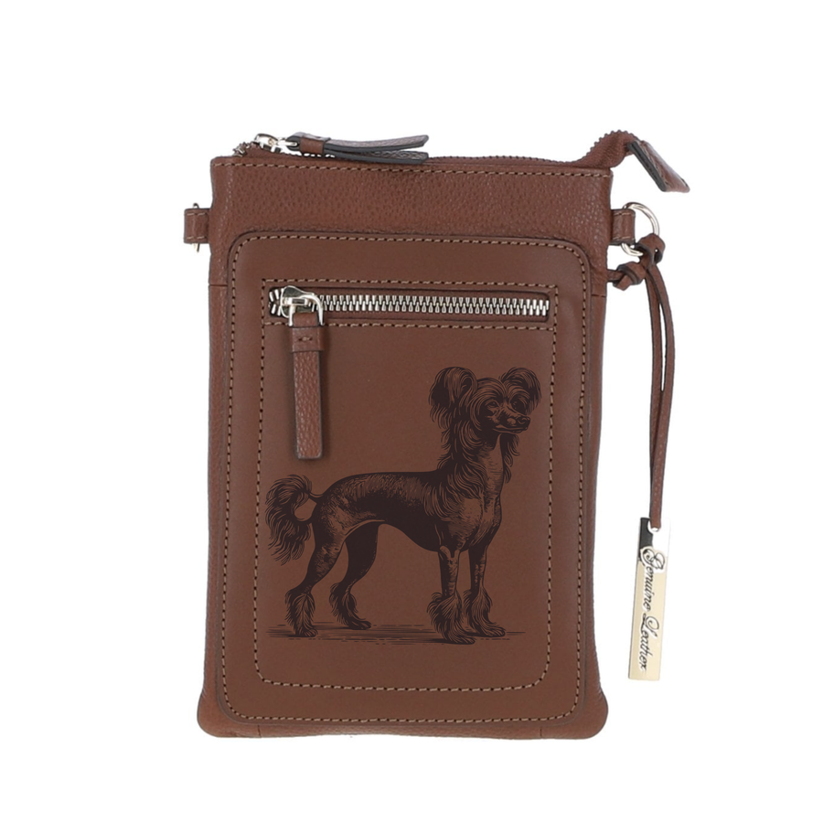 Personalised Chinese Crested Standing Engraved Leather Crossbody Smart