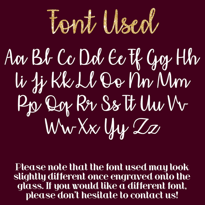 • On Champagne, Gin & Wine Glasses the design (Without text) is approximately 4.5cm. As of January 2021, we have changed Gin glass suppliers. If you have ordered before with this the new style of glass might be slightly different.