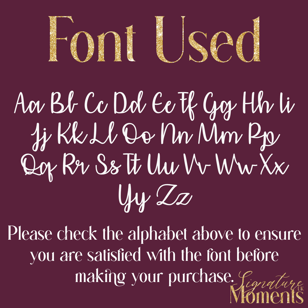 • All text is 1cm high and placed underneath the design. If the personalisation is for a longer name/inscription the name will be on the opposite exterior side to the design, instead of underneath the design.